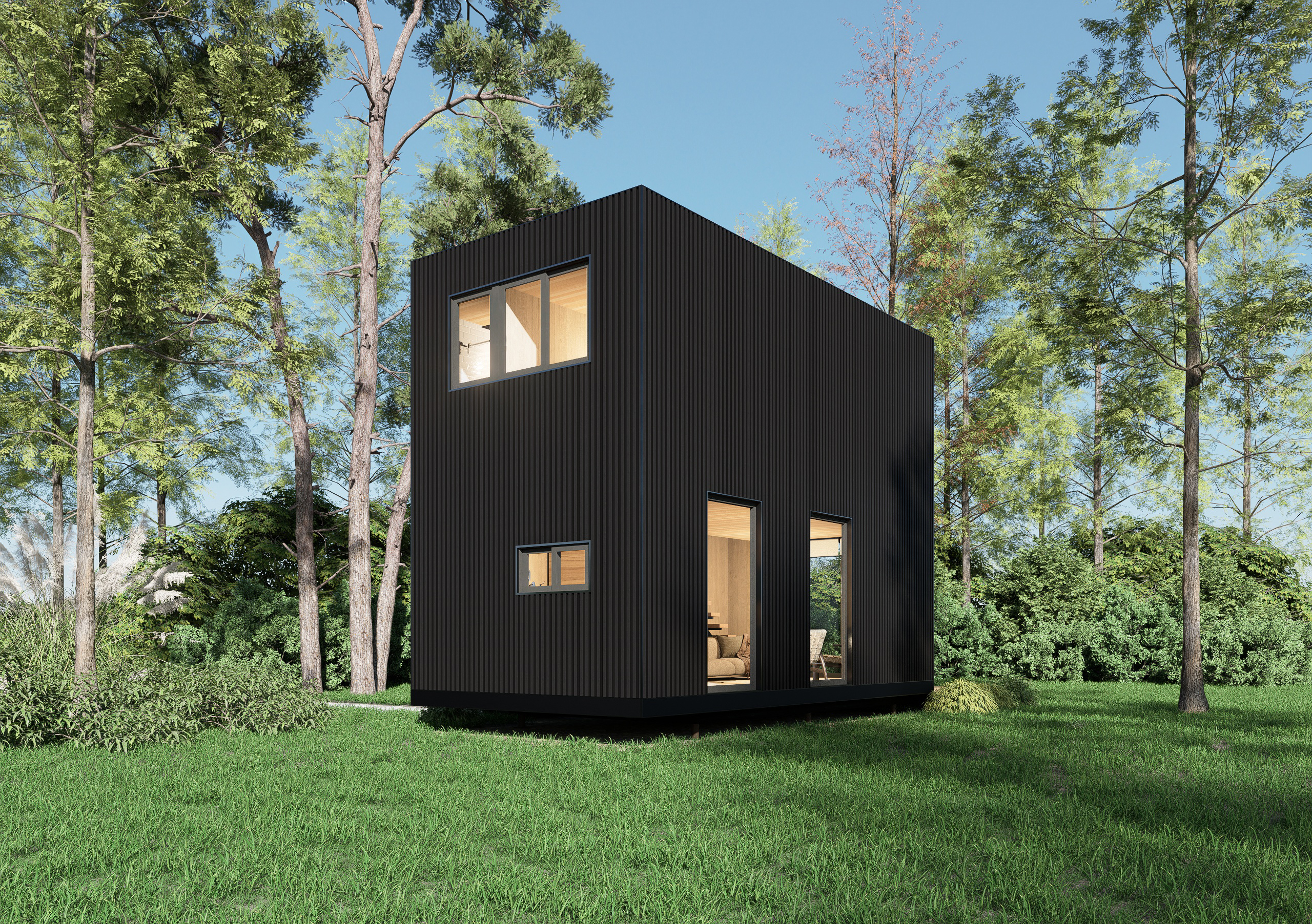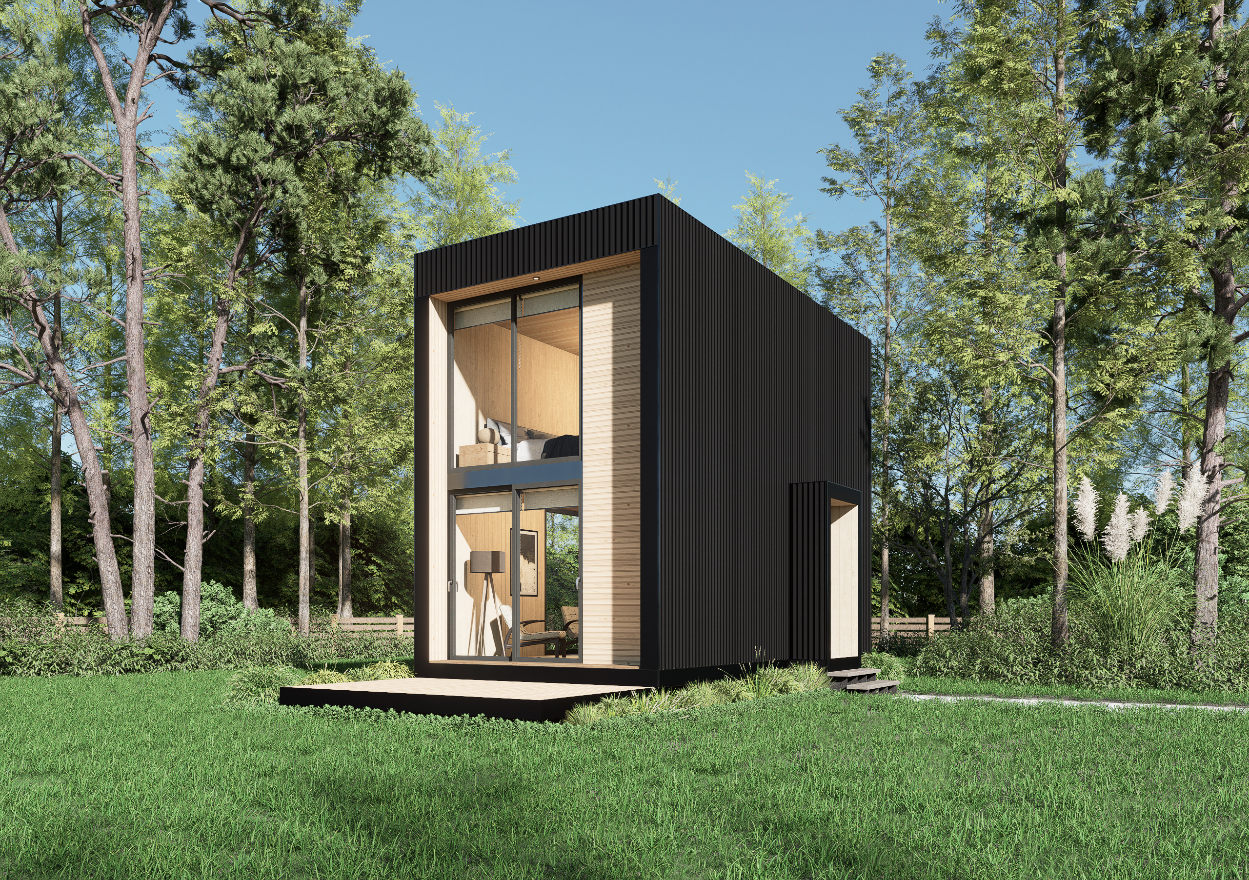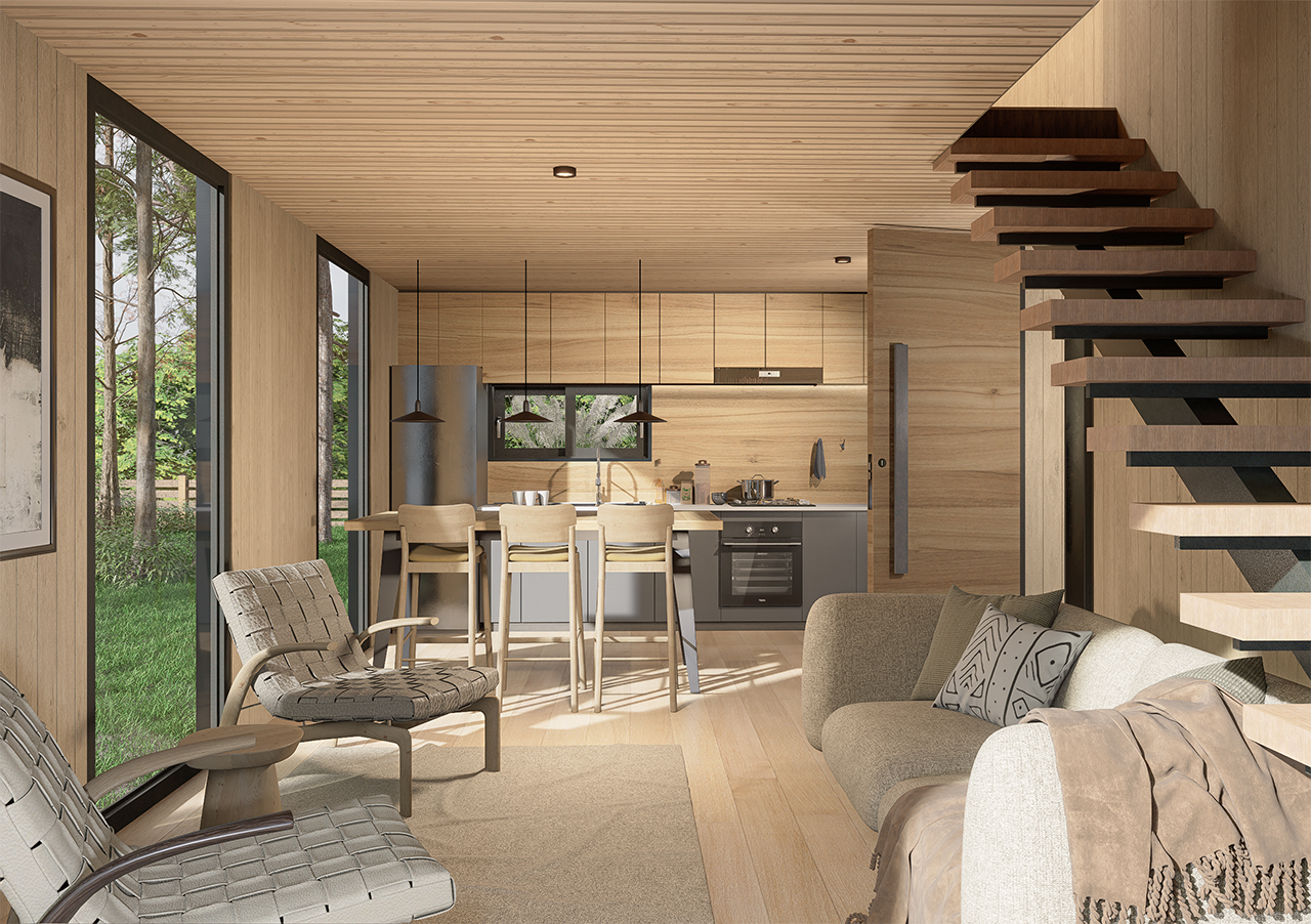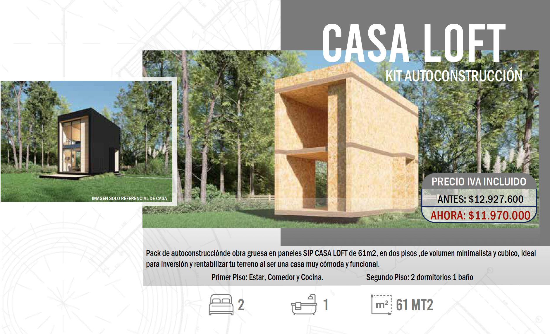 Pack de autoconstrucciónde obra gruesa en paneles SIP CASA LOFT de 61m2, en dos pisos ,de volumen minimalista y cubico, ideal